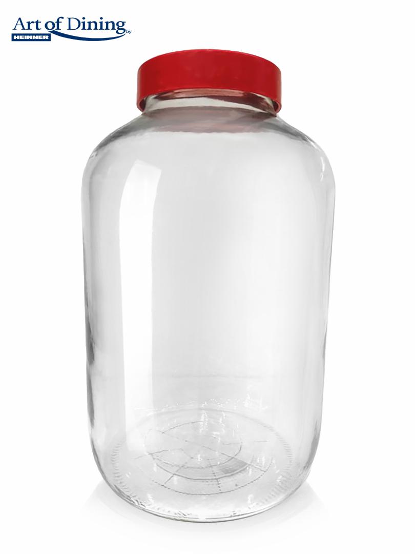 GLASS STORAGE JAR WITH LID , 8 L Cover + plastic handle Color: red cover +white handle Material: glass jar + plastic lid(PP) Capacity: 8 L Diameter: 19.5 cm Height: 33 cm Weight: 2250 gr